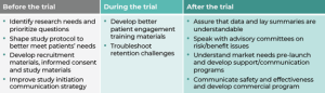 - Ensure early patient collaboration to help design the trial and all patient communication.